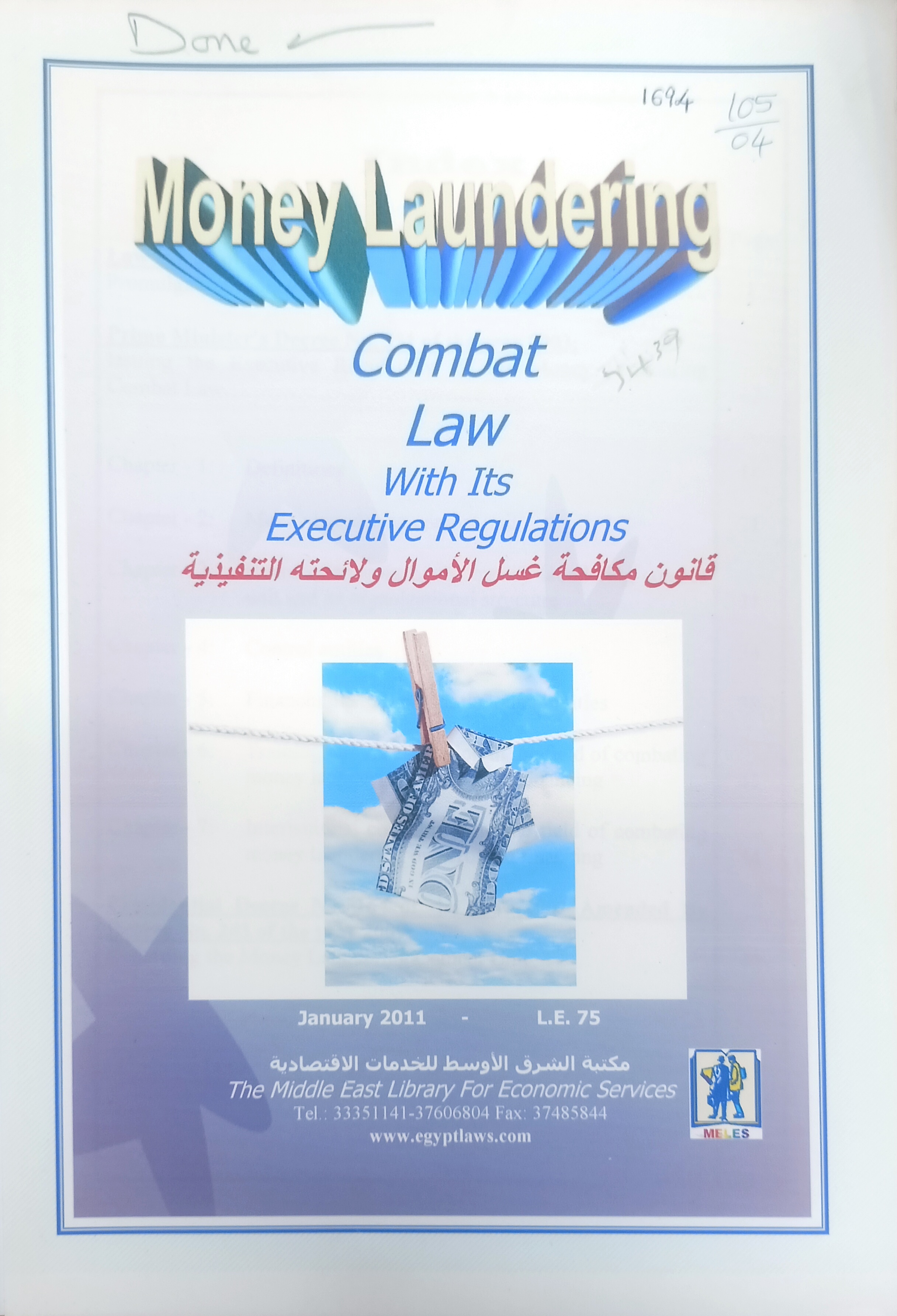 Money laundering combat law with its excutive regulations = قانون مكافحة غسل الأموال ولائحته التنفيذية